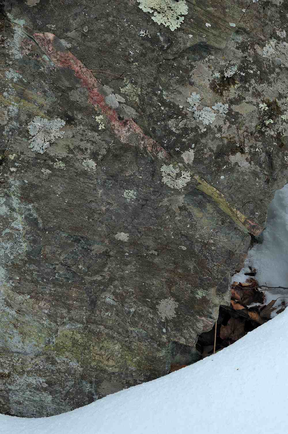 boulder with snow and leaves